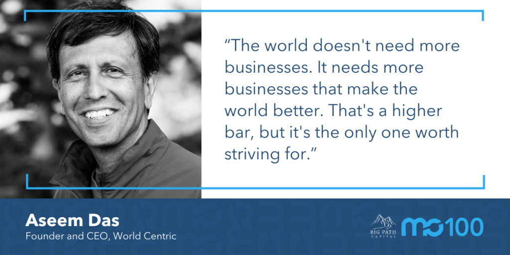 Aseem Das is a repeat MO 100 honoree for his leadership at World Centric, a manufacturer of compostable and reusable foodservice and packaging products that gives 25% of its profits to social and environmental organizations to further their work in creating a better world.